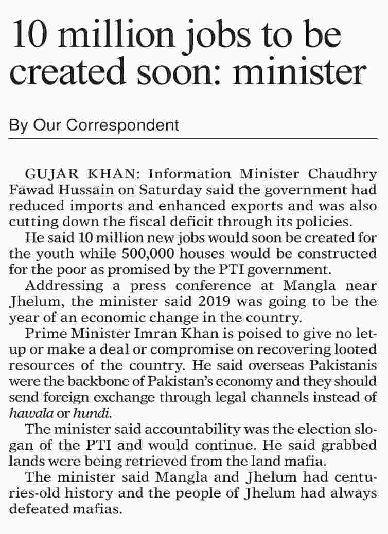 Information Minister Chaudhry Fawad Hussain on Saturday said the government had reduced imports and enhanced exports and was also cutting down the fiscal deficit through its policies. He said 10 million new jobs would soon be created for the youth while 500,000 houses would be constructed for the poor as promised by the PTI government. Addressing a press conference at Mangla near Jhelum, the Minister said 2019 was going to be the year of an economic change in the country. Prime Minister Imran Khan is poised to give no let-up or make a deal or compromise on recovering looted resources of the country. He said overseas Pakistanis were the backbone of Pakistan's economy and they should send foreign exchange through legal channels instead of hawala or hundi. The minister said accountability was the election slogan of the PTI and would continue. He said grabbed lands were being retrieved from the land mafia. The minister said Mangla and Jhelum had centuries-old history and the people of Jhelum had always defeated mafias.