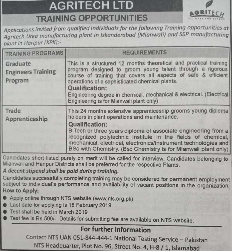 Applications invited from qualified individuals for the following Training opportunities at Agritech Urea manufacturing plant in lskanderabad (Mianwali) and SSP manufacturing plant in Haripur (KPK)