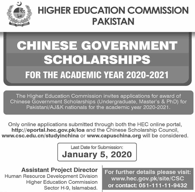 The Higher Education Commission invites applications for award of Chinese Government Scholarships (Undergraduate, Master's & PhD) for Pakistani/ AJ&K nationals for the academic year 2020-2021.