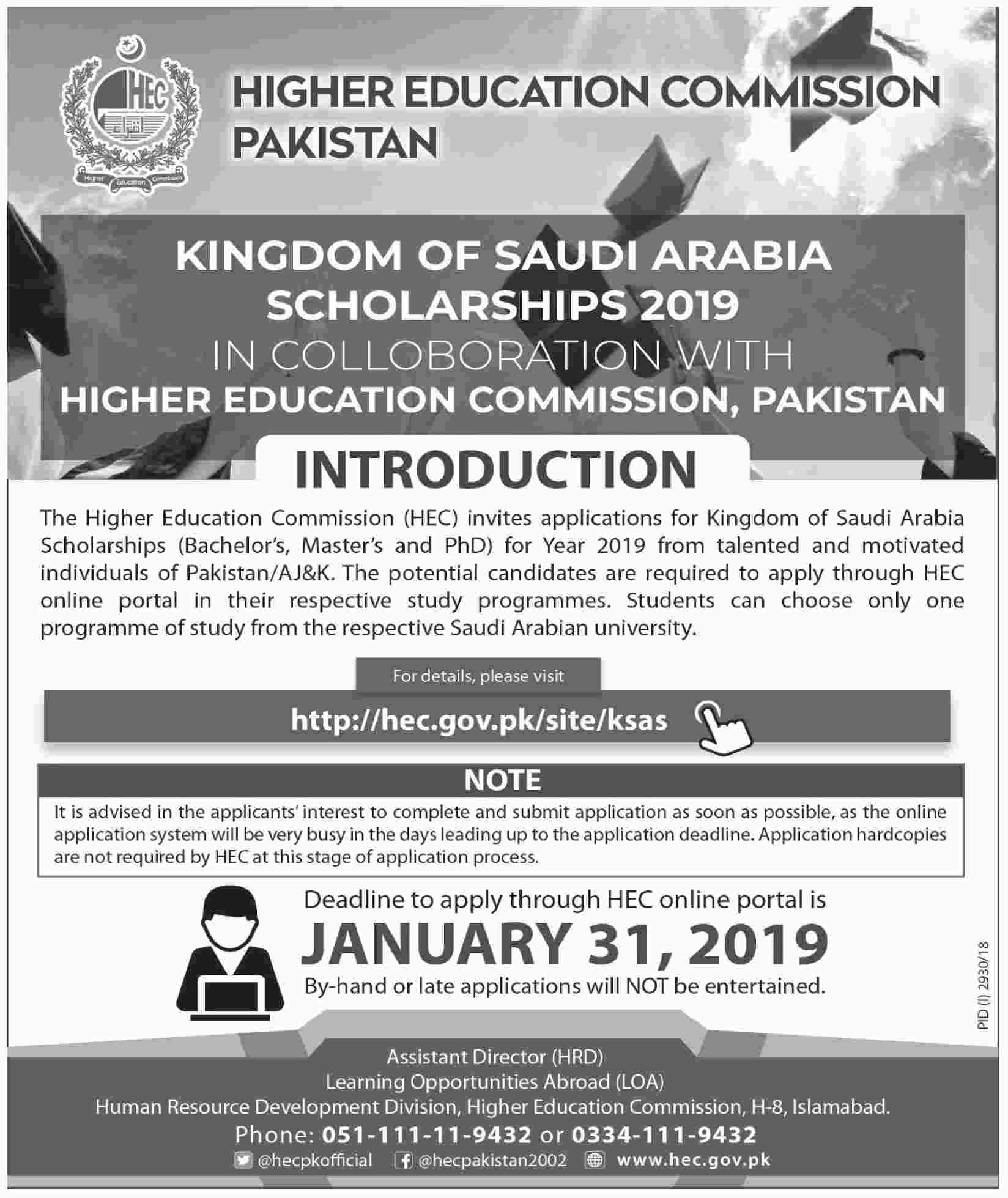 The Higher Education Commission (HEC) invites applications for Kingdom of Saudi Arabia Scholarships (Bachelor's, Master's and PhD) for Year 2019 from talented and motivated individuals of Pakistan/AJ&K. The potential candidates are required to apply through HEC online portal in their respective study programmes. Students can choose only one programme of study from the respective Saudi Arabian university.