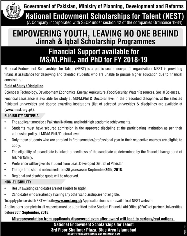 Science & Technology, Development Economics, Energy, Agriculture, Food Security, Water Resources, Social Sciences. Financial assistance is available for study at MS/M.Phil & Doctoral level in the prescribed disciplines at the selected Pakistani universities and degree awarding institutions (list of selected universities & disciplines are available at (www.nest.org.pk).