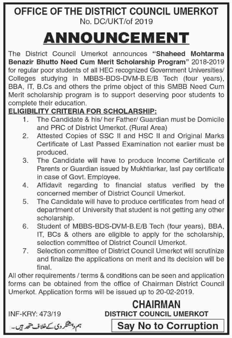 The District Council Umerkot announces "Shaheed Mohtarma Benazir Bhutto Need Cum Merit Scholarship Program" 2018-2019 for regular poor students of all HEC recognized Government Universities/ Colleges studying in MBBS-BDS-DVM-B.E/B Tech (four years).
